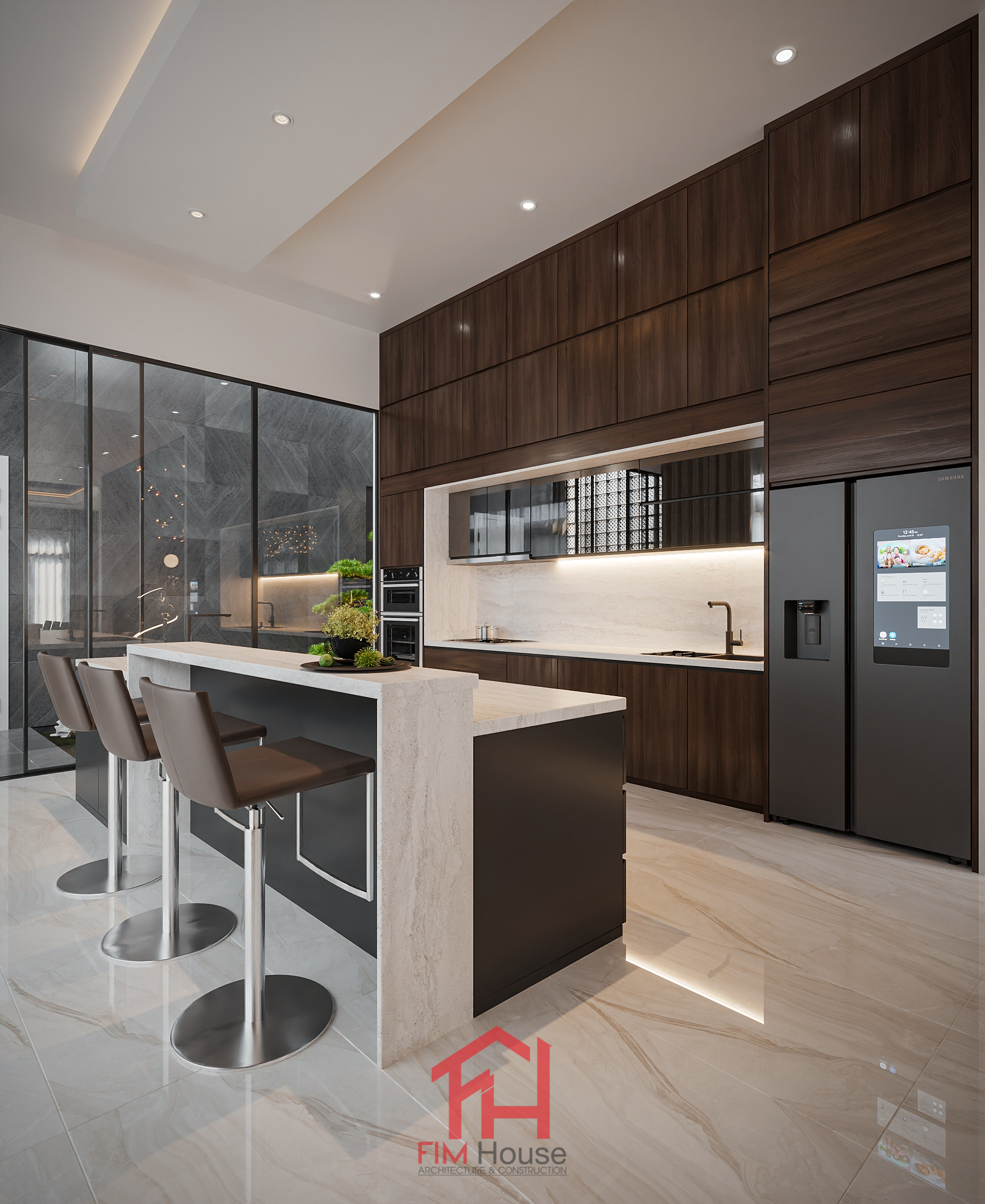 Sự kết hợp giữa “hệ sinh thái” thu nhỏ và phòng bếp là bức tranh hài hòa mang dấu ấn đặc biệt khi đa số những mảng xanh trong ngôi nhà thường được bố trí như một vườn hoa trước nhà, ngoài ban công,… thì mảng xanh của ngôi nhà này lại được thiết kế bên cạnh căn bếp. Sự đặc biệt ấy được đội ngũ Fim House thiết kế mang lại cho khách hàng sự ấm cúng khi cùng nhau quây quần bên mâm cơm gia đình, đồng thời thiết kế đặc sắc một lối đi nhỏ dẫn đến hệ sinh thái bên ngoài giúp cho không gian bếp trở nên tươi mát hơn, giải tỏa những tâm hồn mỏi mệt sau một ngày dài.