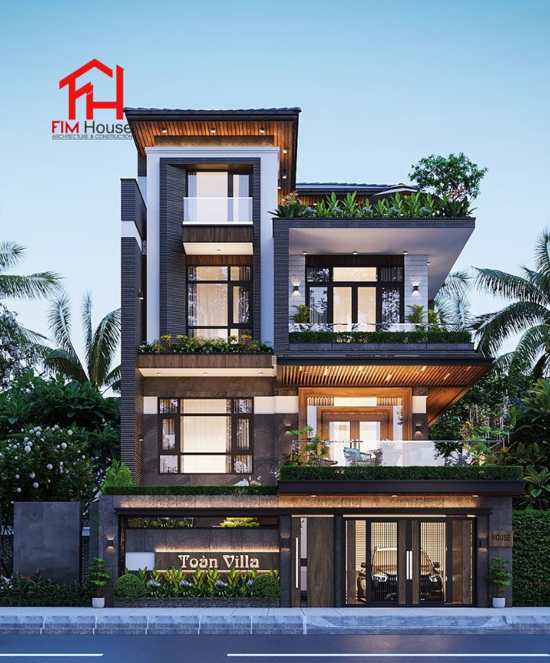 Kiến trúc hiện đại với các mảng tường phẳng, sử dụng vật liệu như kính và gỗ để tạo sự sang trọng. Có tầng sân thượng với khu vực thư giãn và cây xanh, mang lại không gian sống gần gũi với thiên nhiên.